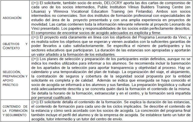 El proyecto de movilidad Leonardo da Vinci presentado por DECROLY es conforme con las normas de la Convocatoria tanto al grupo objetivo, como a la duración y al contenido de las estancias. El tipo de asociación presentada es muy fuerte, el socio de envío y los dos socios intermediarios son centros homólogos, teniendo además una orientación no comercial. Se adjuntan las cartas de compromiso de los dos socios intermedios con los datos referentes a la convocatoria, programa, centro de envío, etc., correctamente citados. Aunque no se adjuntan cartas de compromiso de socios de acogida, el tipo de centro y la experiencia en este tipo de gestión garantiza su correcto desarrollo. Todas las secciones están cumplimentadas satisfactoriamente, la información aportada es clara y completa y existe coherencia desde el primer apartado hasta el último. Todo ello garantiza una formación completa y de calidad.