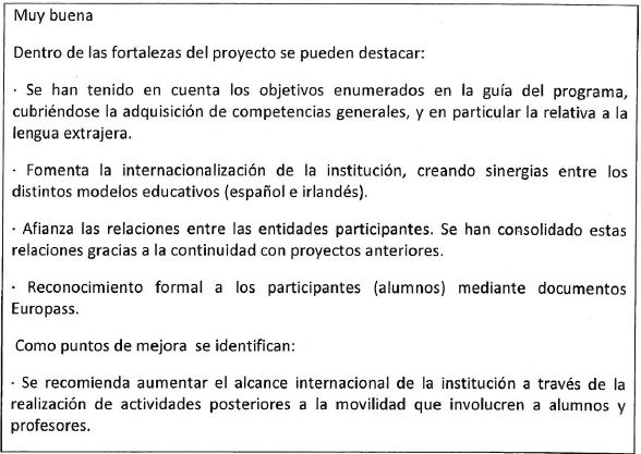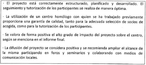 convocatoria. La asociación es buena y capaz de llevar a cabo el proyecto. También recoge algunos fallos en aspectos como la no descripción de las necesidades de los alumnos, en la información y selección de los participantes y en no concretar los aspectos contractuales.