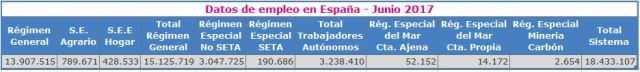 Por otro lado, las cifras de empleo y paro en España a 30 de junio de 2017 se sitúan en 18.433.107 los cotizantes y 3.362.811 las personas desempleadas. En este dato de empleo se incluyen, también, los trabajadores autónomos del Régimen General, los del Régimen Especial del Mar y los de Minería y Carbón que suman un total de 3.307.388 trabajadoras.