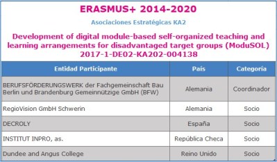 En este caso, acompaña a Berufsfórderungswerk der Fachgemeinschaft Bau Berlin und Brandenburg Gemeinnützige GmbH (BFW), mediante una Asociación Estratégica (KA2), además de Decroly, otros TRES centros e instituciones de Alemania, República Checa y Escocia. La Agencia Nacional alemana ha aprobado su propuesta para desarrollar el proyecto ModuSol, con el nº 2017-1-DE02-KA202-004138. En esta ocasión referida a una Asociación Estratégica de cooperación para la innovación y el intercambio de buenas prácticas en el sector de la Formación Profesional KA (202).