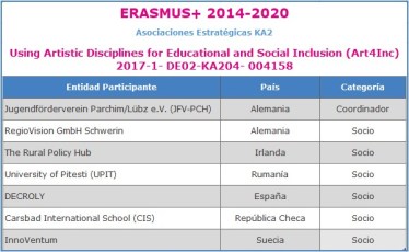 En DECROLY PARTICIPARÁ EN EL PROYECTO EUROPEO ART4INC, de 08 de agosto de 2017, hice público la aceptación de la propuesta presentada en la Agencia Nacional Erasmus alemana por la entidad Jugendförderverein Parchim/Lübz e.V. (JFV-PCH) que coordina una Asociación Estratégica (KA2) compuesta por otras SEIS instituciones de Alemania, Irlanda, Rumanía, República Checa y Suecia, además de Decroly del proyecto nº 2017-1-DE02-KA204-004158 “Using Artistic Disciplines for Educational and Social Inclusion – Art4Inc” -Uso de disciplinas artísticas para la inclusión educativa y Social (Art4Inc)-, por su traducción al español. Se trata de una Asociación Estratégica de cooperación para la innovación y el intercambio de buenas prácticas en el sector de las personas adultas KA (204).