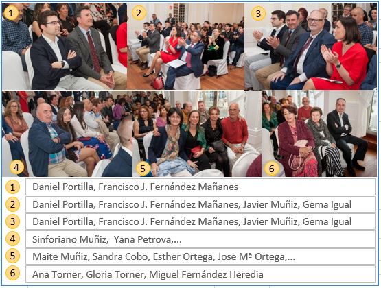 Permitidme expresar mi gratitud, también, a todos los amigos de Decroly y míos que nos acompañaron en este día tan señalado. Algunos hicieron un verdadero esfuerzo para poder estar en vivo y en directo en la ceremonia. Es el caso de Antonio Gutiérrez, José Álvarez, Charly Sáinz-Pardo, Pilar Quevedo, Zaida Merino, Belén Rey, Thomas Gramse, Mª Eugenia Cuenca, José Ramón Catillo, Teresa Iglesias, José Ruiz y Merche Barriuso, Chechu y Nieves Echeverría, Gloria y Ana María Torner, Miguel Fernández, José Pedro Pérez, Belén Serna y Edith Cory, Paulino Alonso, Vicente Alciturri, Juan Carlos Corniero, Francisco Acero, Miguel Ángel Serna, José Manuel Igual, Francisco Rodríguez, Bienvenido Doalto y María Ascensión Iglesias, José María Gómez y Marcia Santos, Halyna y Vitaliy Klevan, Yuliya Bocharova, Mykola Kurnytskyy, Viktoria Goncharenco, Begoña González y Juan Fernández, Pedro Pérez, Jesús Ruiz, María José Ortiz, Antonio García y Natalia Collar, Miguel Ángel y Angelines Cuerno,… ¡Gracias por estar aquí!