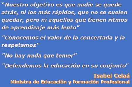 En cuanto a la citas a la que me refería al inicio de esta entrada, veamos alguna de esas frases significativas pronunciadas por Isabel Celaá y que no han pasado desapercibidas. Yo las valoro como una declaración de intenciones por parte de la ministra, altamente positiva.