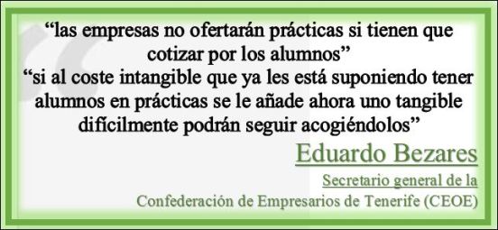Los empresarios canarios, por ejemplo, manifiestan sin complejo alguno que “las empresas no ofertarán prácticas si tienen que cotizar por los alumnos”. Simultáneamente, el secretario general de la Confederación de Empresarios de Tenerife (CEOE), Eduardo Bezares, ha deslizado una serie de frases que no han pasado desapercibidas, tales como: “no solo no nos gusta la forma” en la que el Gobierno ha aprobado esta medida calificada de “urgente” en el Real Decreto-Ley 28/2018 de 28 de diciembre, “sin diálogo ni acuerdo alguno”. Esta medida ha generado una enorme confusión y “tiene un objetivo claramente recaudatorio”. Por otro lado, recordó Bezares, el 96% de las empresas de Canarias tienen menos de 10 trabajadores con lo que “si al coste intangible que ya les está suponiendo tener alumnos en prácticas se le añade ahora uno tangible difícilmente podrán seguir acogiéndolos”.