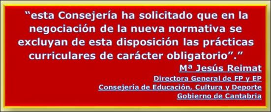 Por su parte, la Consejería de Educación, Cultura y Deporte del Gobierno de Cantabria, emitió un comunicado dirigido a todos los centros de Formación Profesional a través de la directora general de Formación Profesional y Educación Permanente, Mª Jesús Reimat, para informar de su punto de vista sobre el particular. Lo más significativo del escrito quedó reflejado en el párrafo final que decía: “esta Consejería ha solicitado que en la negociación de la nueva normativa se excluyan de esta disposición las prácticas curriculares de carácter obligatorio”.