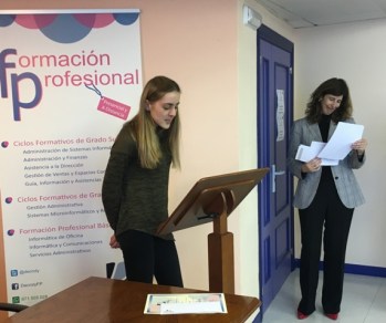 “Inspiración” es el título del trabajo presentado por María José Ocampos Paradeda, alumna de primer curso de Servicios Administrativos (SAD) de Formación Profesional Básica (FP Básica), galardonada con el tercer premio. De nuevo nos encontramos con una historia autobiográfica que emocionó a todos los asistentes al evento. Su relató giró en torno a sus históricas dificultades para expresarse y que, según describe, “siempre le ha resultado muy difícil inspirarse, nunca he sabido como felicitar en los cumpleaños o qué decir cuando me cantan cumpleaños feliz o cuando me dicen cosas bonitas”.