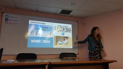También, Arrate expuso a los alumnos la problemática que supone una adición a los teléfonos móviles. Para que estos se dieran cuenta de que es una problemática que nos afecta más de lo que pensamos, la ponente explicó una serie de sintomatologías con las que casi todos podemos sentirnos identificados.