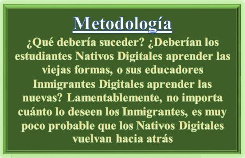 Como educadores, tenemos que pensar cómo enseñar contenido tanto heredado como futuro en el idioma de los Nativos Digitales. Lo primero implica una importante traducción y cambio en la metodología; lo segundo incluye todo ese nuevo contenido y pensamiento añadido. No está realmente claro para mí qué es más difícil: si “aprender cosas nuevas” o “aprender nuevas maneras de hacer las cosas viejas”. Sospecho que lo último.