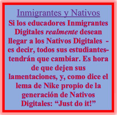 Por lo tanto, si los educadores Inmigrantes Digitales realmente desean llegar a los Nativos Digitales -es decir, todos sus estudiantes- tendrán que cambiar. Es hora de que dejen sus lamentaciones, y, como dice el lema de Nike propio de la generación de Nativos Digitales: “Just do it!” Ellos ganarán a largo plazo, y sus éxitos llegarán mucho antes si sus responsables les apoyan.
