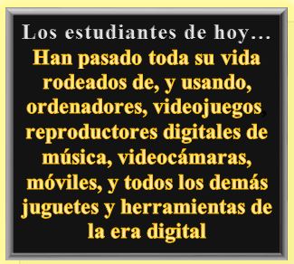 Los estudiantes de hoy -desde la guardería a la universidad- representan las primeras generaciones que han crecido con esta nueva tecnología. Han pasado toda su vida rodeados de, y usando, ordenadores, videojuegos, reproductores digitales de música, videocámaras, móviles, y todos los demás juguetes y herramientas de la era digital. Hoy en día la media de los graduados universitarios ha pasado menos de 5.000 horas de su vida leyendo, pero más de 10.000 horas jugando con videojuegos (por no hablar de las 20.000 horas viendo la televisión). Los juegos de ordenador, el correo electrónico, internet, los teléfonos móviles y la mensajería instantánea son parte integrante de sus vidas.