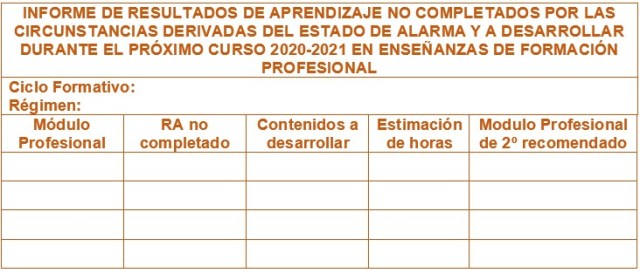 El informe constará de una tabla incluyendo cada módulo profesional, la relación de resultados de aprendizaje no completados y que se considera que deban de ser desarrollados en el próximo curso, los contenidos a desarrollar, una estimación del número de horas necesarias para ello y el módulo profesional de segundo curso recomendado para incluirlos. El informe deberá formar parte de la Memoria Final de Curso. A modo de orientación se puede tomar como referencia la siguiente plantilla: