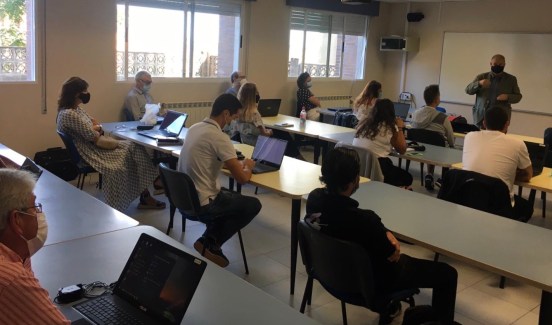 El profesorado y personal de administración y servicios (PAS) se incorporó hoy, martes 1 de setiembre, y después del protocolario saludo de bienvenida, y una vez tomada la temperatura de cada uno, inició una acción formativa “Medidas de Prevención e Higiene, Protocolo y Plan de Contingencia Curso 2020-2021”, organizada en dos grupos de 20 participantes, dirigida por el coordinador TIC, Sergio Ibáñez, e impartida por el jefe de estudios, Pedro Cuesta y por Emma Tato Velasco, graduada en enfermería por la Universidad de Salamanca y colaboradora docente de los alumnos de la Escuela Universitaria de Enfermería del Hospital Universitario “Marqués de Valdecilla”.