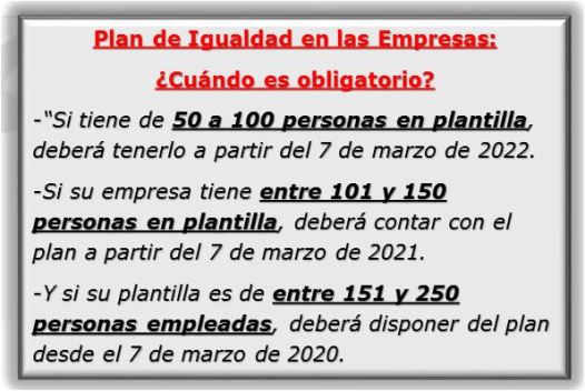 - Las empresas con cincuenta o más personas en plantilla tienen la obligatoriedad de elaborar e implementar un Plan de Igualdad de Empresa. Esta obligación se implantará de forma paulatina en los próximos años en función del tamaño de su empresa. En concreto: