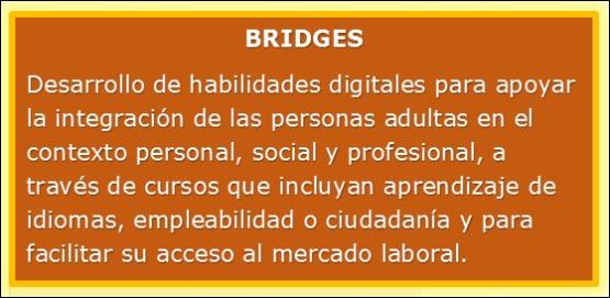 BRIDGES, como queda dicho anteriormente, pone el foco en el desarrollo de habilidades digitales para apoyar la integración de las personas adultas en el contexto personal, social y profesional, a través de cursos que incluyan aprendizaje de idiomas, empleabilidad o ciudadanía. Estas destrezas digitales mejorarán las oportunidades de vida de los ciudadanos y facilitarán su acceso al mercado laboral. Para ello, se utilizarán prácticas innovadoras, así como enfoques interdisciplinares, que apoyen el desarrollo de competencias transversales y del pensamiento creativo.