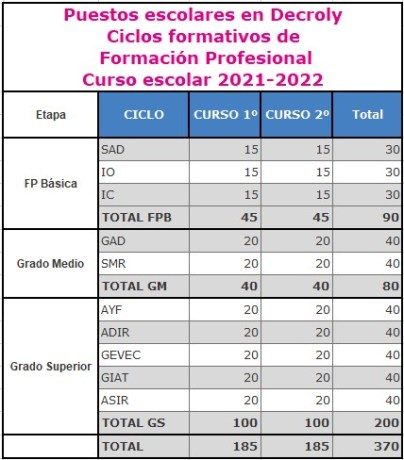 Decroly imparte, por tanto, 10 ciclos formativos: 3, de FP Básica; 2, de Grado Medio y 5, de Grado Superior.