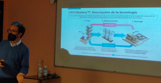 La sesión comenzó con la exposición por parte del ponente de los antecedentes antes referidos para, seguidamente, explicar a los asistentes los diferentes sistemas de almacenamiento de energía existentes en la actualidad (bombeo hidráulico, baterías de ion-litio, almacenamiento mediante aire líquido o cryobateryTM, etc.); sistemas que no tienen por qué competir en el mercado dada la complementariedad de todos ellos para conseguir el objetivo común: mantener la estabilidad de la red, evitando el caos que, para los usuarios de la electricidad, pueden causar altos precios de demanda pico, cortes de energía e incluso apagones.
