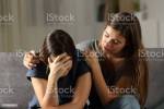Teen comforting hes sad friend in the night sitting on a couch in the living room at home