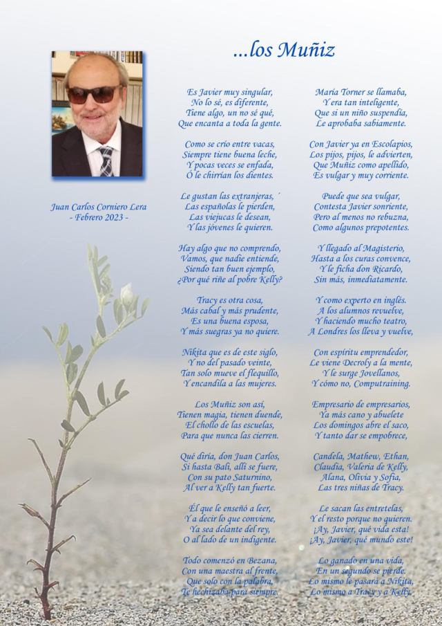 Hoy le traigo a la palestra por razones emocionales que me han impresionado. Casi todos los días, Juan Carlos me envía, a primera hora de la mañana, lo que denomina “poema del día”. Pues bien, el martes pasado, una vez recibido y leído su escrito le contesté que uno de estos días recibiré un poema suyo dedicado a mi. Ni corto ni perezoso se puso manos a la obra y no habían transcurrido 30 minutos cuando recibí el bello poema que os adjunto a continuación. Simple y llanamente, impresionante.